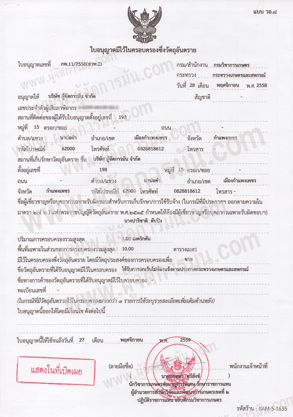 ใบอนุญาตขายปุ๋ย, ใบอนุญาตมีไว้ในครอบครองซึ่งวัตถุอันตราย